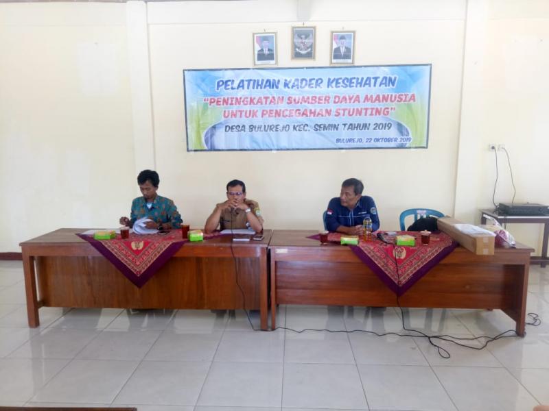 Bulurejo(SID), pada hari ini Selasa 22 Oktober 2019 bertempat di Balai Desa Bulurejo dilaksanakan pelatihan kader kesehatan dalam rangka pencegahan Stunting. Pelatihan yang mengusung tema "Peningkatan Sumberdaya Manusia Untuk Pencegahan Stunting" dihadiri oleh perwakilaN kAder masing masing Posyandu Serta Guru PAUD yang ada diwilayah Desa Bulurejo. Hadir Sebagai Nara Sumber Drs. Eratus Dana S dari TA KAbupaten Gunungkidul. Acara Pelatihan dimulai Pukul 09.00 dibuka langsung oleh Supaya selaku Kepala Desa Bulurejo. Pelatihan Kader Pemberdayaan MAsyarakat (KPM) yang hari ini dilaksanakan merupakan tindak lanjut dari pelatihan KPM yang telah dilaksanakan di tingkat Kabupaten.